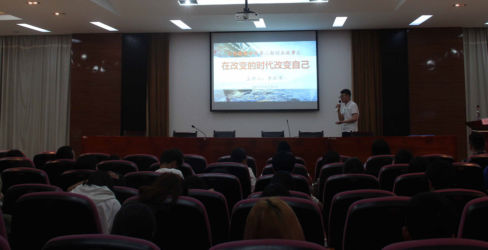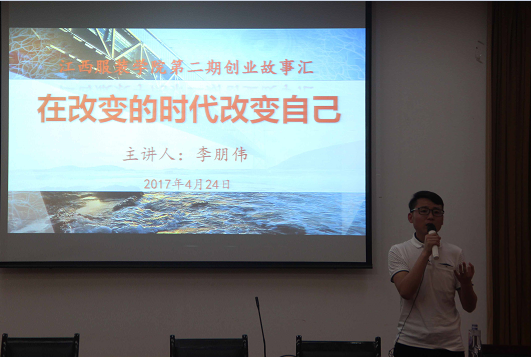 4月24日晚上19:00,江西服装学院在校行政楼一楼报告厅举办第二期创业故事汇。本期创业故事汇的主题是“在改变的时代改变自己”,主讲人为我校13届校友——福建省京猫创业投资有限公司总经理李朋伟。参加本次创业故事汇的有大学生创业孵化基地、创业学院各项目团队代表、大学生创新创业联合会学生干部以及各学院师生代表。