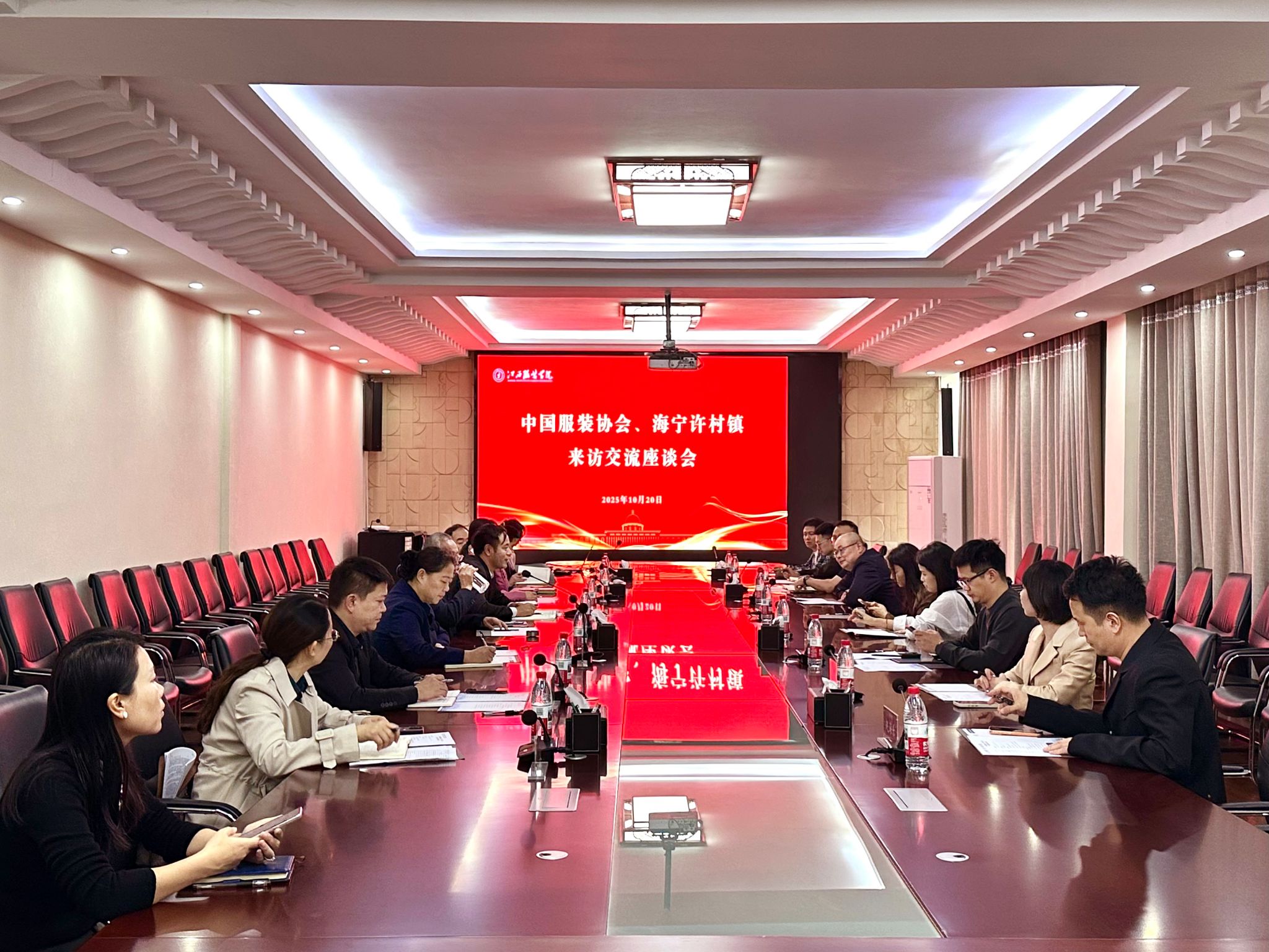 2025年10月20日下午15:10,中国服装协会、海宁许村镇与江西服装学院交流座谈会在江西服装学院行政楼二楼会议室如期举行。此次会议,中国服装协会外联部副主任王延、项目主任葛雪欢到场参与;许村镇人民政府党委书记许新峰等政府人员及当地服装协会代表一同出席;江西服装学院刘孜杰副校长、马国照副校长与学校创新创业学院、教务处、就业处及各相关二级学院负责人共同参会,各方汇聚,旨在为潜在合作搭建沟通平台。