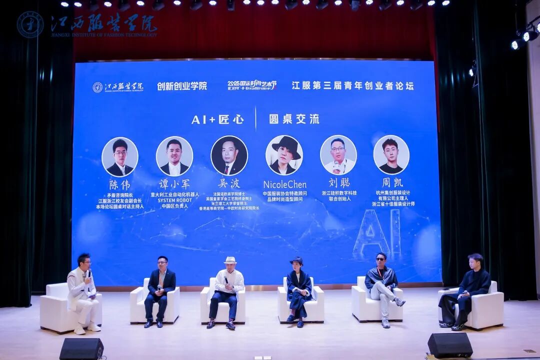 论坛后半程进入圆桌交流环节,特邀吴波、Nicole Chen、意大利工业自动化机器人SYSTEM ROBOT中国区负责人谭小军、浙江硅积数字科技联合创始人刘聪、杭州集创服装设计有限公司主理人(浙江省十佳服装设计师)周凯五位嘉宾登台,由江服2004届校友、杭州矛盾商学院院长陈伟担任主持人。