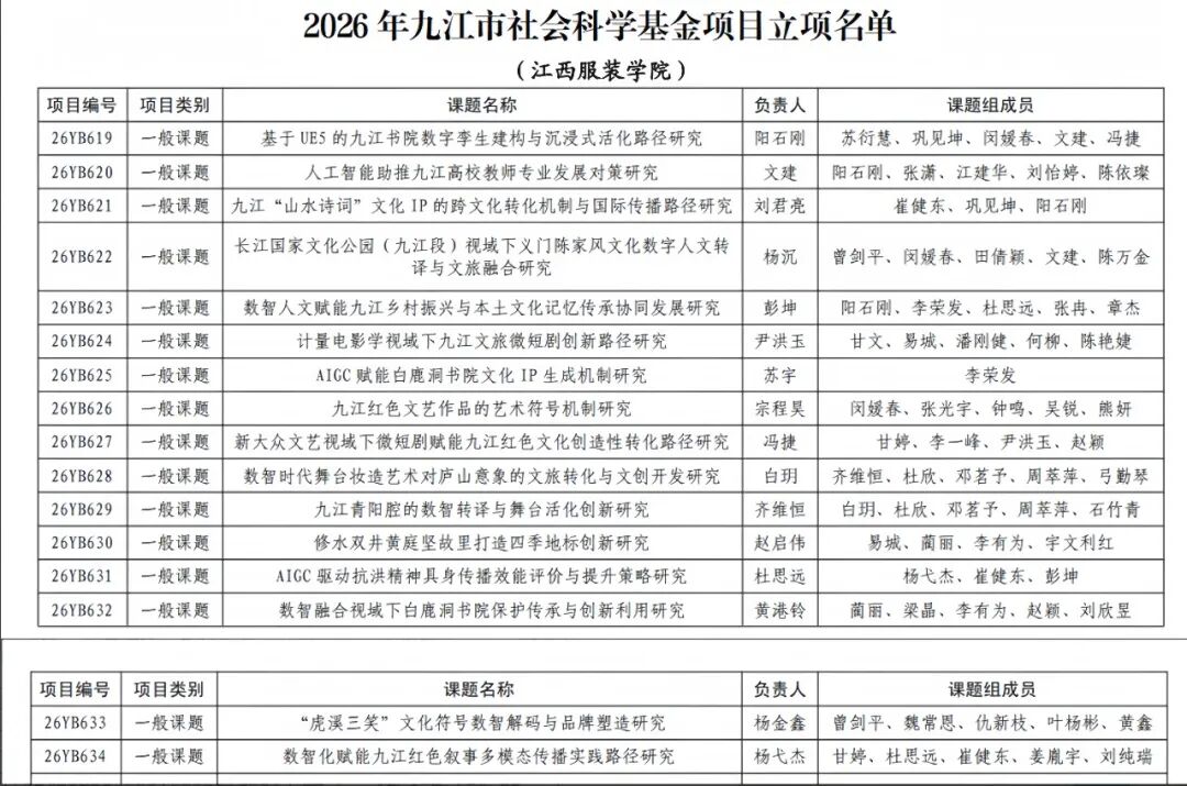 近年来,江西服装学院高度重视科研工作与学科建设,持续优化科研生态、强化团队培育、鼓励服务地方发展。广大教师深耕学术、潜心研究,在社会科学研究领域不断突破,科研项目立项数量稳步提升、研究层次持续进阶,形成一批聚焦地方、服务社会、特色鲜明的高质量研究成果。此次多项课题成功立项,是学校科研能力稳步提升、学科建设扎实推进、产学研深度融合的重要标志性成果。