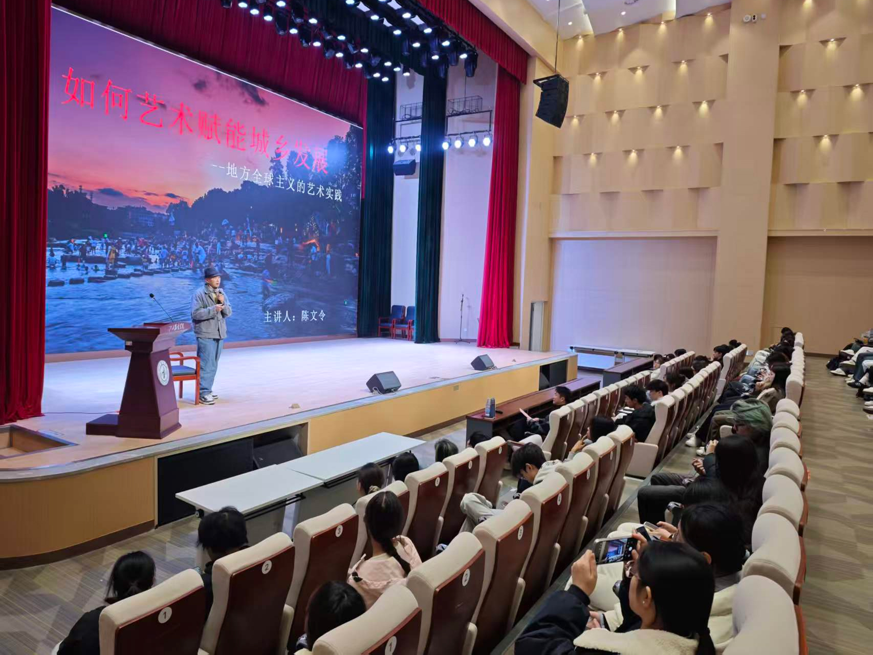 讲座现场,陈文令先生结合自身数十年的艺术创作经历与跨界实践经验,围绕艺术创新的内核、跨界创作的思维突破、艺术乡建的实践之路、创意如何转化为实践成果等核心内容展开分享。他用生动的案例讲述了自己从传统雕塑创作,到拓展多元艺术媒介,再到投身艺术乡建、打造公共艺术空间的历程,深刻诠释了“创新不止于形式,更在于思想”的核心理念。他指出,无论是艺术创作还是创新创业,都需要保持对生活的敏锐感知,敢于打破固有认知,勇于尝试未知领域,同时坚守初心,将个人创作与社会价值、时代需求相结合,才能让创意真正落地生根、绽放价值。
